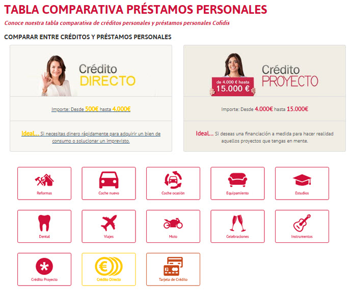 En la actualidad existen en Cofidis créditos destinados a proyectos concretos, denominados Credito Proyecto, o bien para cantidades más pequeña y sin explicaciones: Credito Directo.